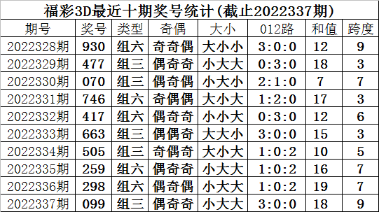 开奖回顾:福彩3D第2022337期奖号为099,奖号形态为:组三、小大大、3:0:0、偶奇奇。