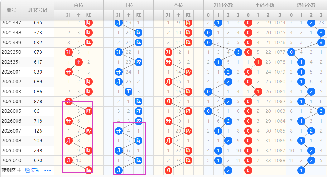 【排列3个位】:近期升降走势为:升-降-升-降-升-降-降,为一种交错走势,结合走势图可以看出,图中紫色框圈出为一种M形态的出球方式,本期可以重点看好升的形态号码的开出。