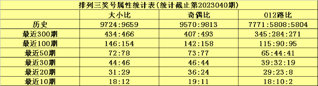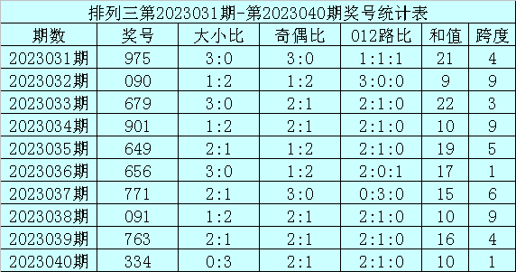 上期回顾:排列三第2023040期奖号为334,奖号012路比为2:1:0,奇偶比为2:1,大小比为0:3,和值为10,跨度为1。