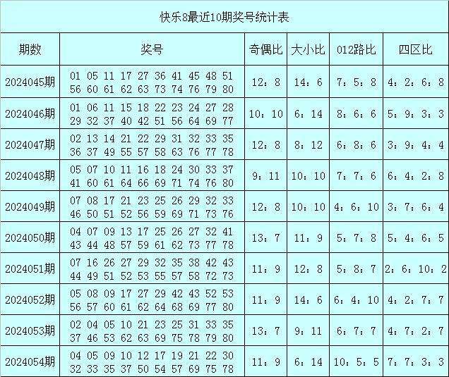 福彩快乐8第2024054期开出奖号:04 05 09 10 12 17 19 21 22 30 32 33 35 37 50 54 57 69 75 78,其中奖号奇偶比为11:9,大小比为6:14,012路比为10:5:5,四区比为7:7:3:3。