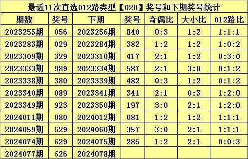 排列三上期开出奖号为:626,其直选012路类型为020,历史上直选020号码已开出了330次,最近11期分别开出奖号为:056、029、329、989、380、089、923、080、629、629、626。