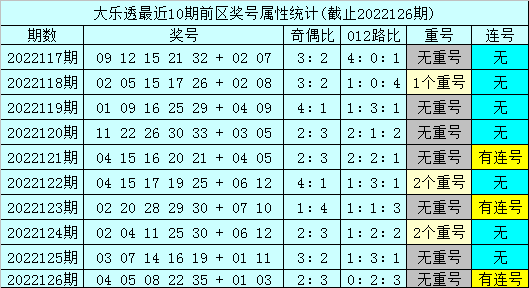 前区奇偶比分析:最近10期前区号码奇偶总比例为26:24,奇偶号码走势相当,上期奖号奇偶比为2:3,本期适当关注奇数号码走热,预计开出奇偶比3:2。