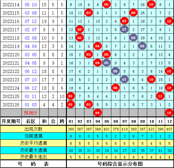 上期回顾:体彩大乐透第2022126期奖号为:04 05 08 22 35 + 01 03,其中前区号码012路比为0:2:3,奇偶比为2:3,没有开出重复号码。后区号码和值为4,跨度为2。