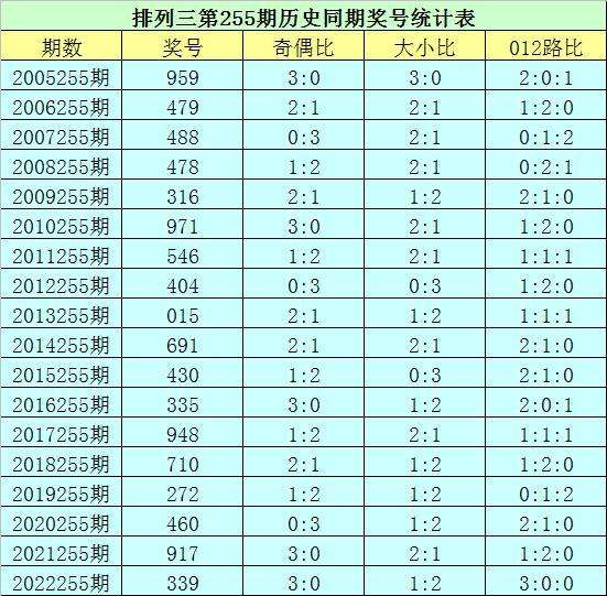 排列三第2023255期开奖日期:2023年9月22日,历史上第255期已开出了18次奖号,历年同期号码分别为:959、479、488、478、316、971、546、404、015、691、430、335、948、710、272、460、917、339。