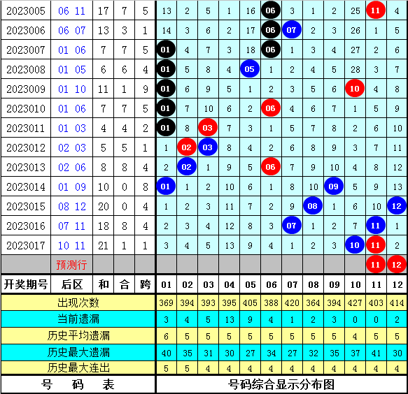 前区五区分析:上期第一、四区出号比例较高,第三、五区号码轮空。本期注意各区平衡,分别开出1个奖号。
