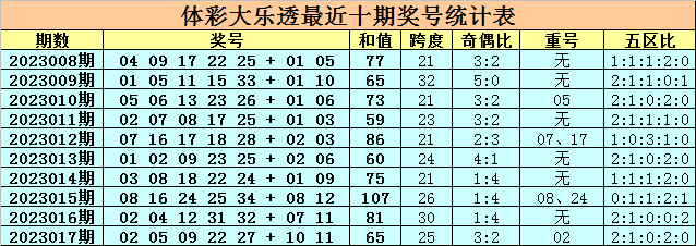 上期开奖:大乐透第2023017期奖号为:02 05 09 22 27 + 10 11,前区号码和值为65,跨度为25,奇偶比为3:2,重号:02,五区比为2:1:0:2:0。