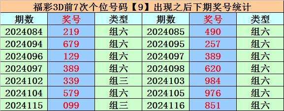 在最近个位奖号中,号码9前7次开出之后,下期分别落号:0、7、9、0、4、6、1,其中奖号大小比为3:4,012路比为4:3:0,奇偶比为3:4。