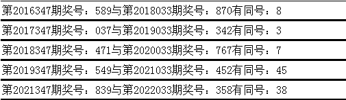 与前期历史同期奖号对比分析,在最近五年开奖中,第347期同期奖号与第033期同期奖号都出现了相同号码: