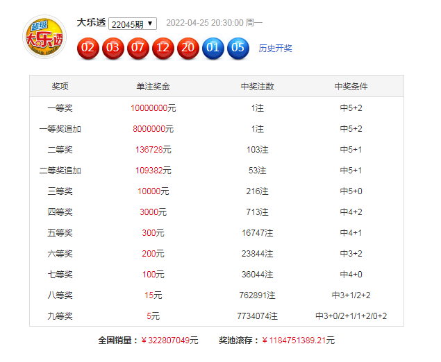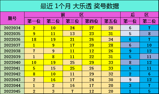 大乐透第2022045期奖号开出:02 03 07 12 20 + 01 05,各位奖号遗漏期数分别为:0期、17期、6期、6期、0期+12期、5期,前区遗漏总值为29期,冷温热码个数比为1:2:2。