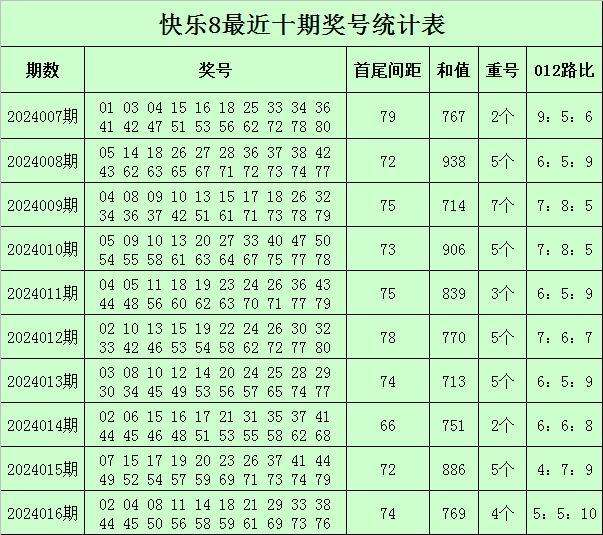 福彩快乐8第2024016期开奖回顾:02 04 08 11 14 18 21 29 33 38 44 45 50 56 58 59 61 69 73 76,其中奖号首尾间距为74,和值为769,012路比为5:5:10,包含6组同尾号码:11-21-61、33-73、04-14-44、56-76、08-18-38-58、29-59-69,开出4个重号:44、59、69、73。