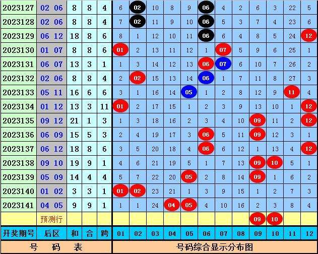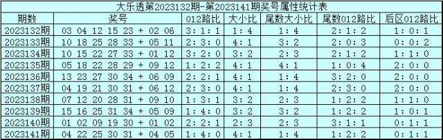 2、前区奖号012路分析:最近9期前区012路比为15:25:5,其中0路、1路没有出现轮空现象,2路轮空5次。最近3期前区012路比为4:10:1,本期注意012路基本平衡,参考012路比2:1:2。