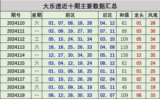 上期回顾:大乐透开出奖号:前区06 12 28 30 33;后区02 07。前区和值:109,龙头06,凤尾33。