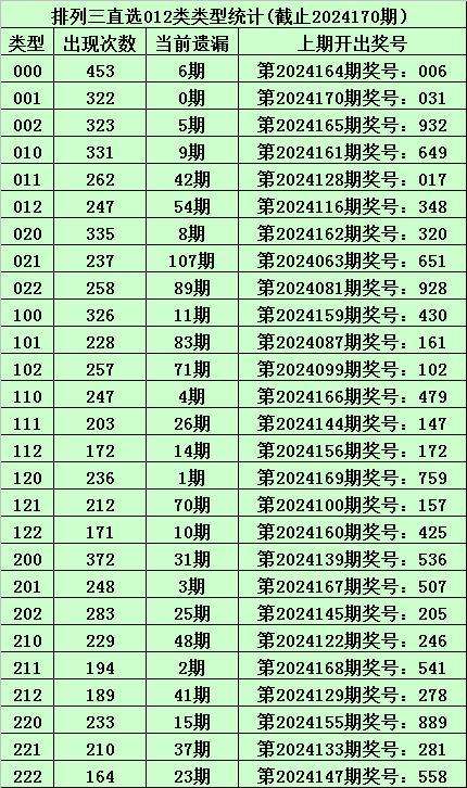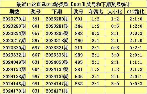 上期回顾:体彩排列三第2024170期开出奖号:031,其012路比为2:1:0,奖号012路类型为:001。