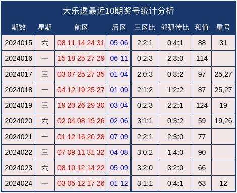 上期回顾:大乐透2024024期开出奖号:前区03、05、12、17、26,后区01、12。