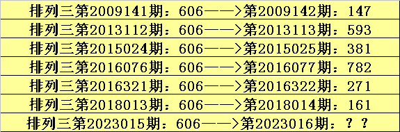 第2023015期排列三奖号为606,历史上该号码直选出现7次,下期奖号分别为:147、593、381、782、271、161。