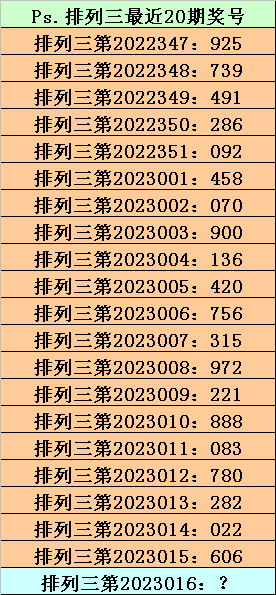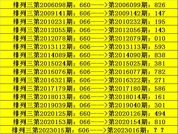 第2023015期排列三奖号为606,历史上该号码组选开出16次,下期奖号分别为:826、147、195、143、010、593、838、381、782、271、586、161、301、494、810。