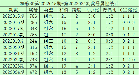 3。福彩3D第22025期0123567、0134569、0145679解冻的概率较小,则剩余三码开出号码的可能就较大,否则注意组三。