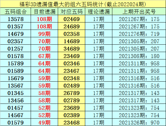 1。截止第22024期,五码组六遗漏最大的是:13578、01357,当前遗漏108期。