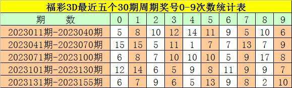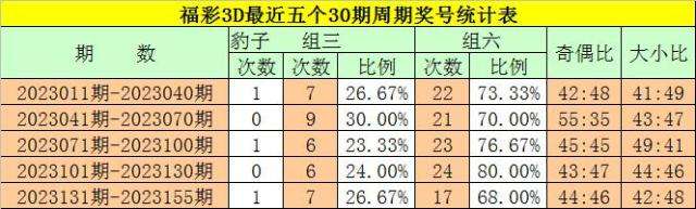 在最近一个30期周期内(第2023131期-第2023160期),组三(含豹子)号码共出现8期,占开奖总数的32%,组六奖号共出现17期,开出比例为68%,组六号码连续出现4期,表现非常活跃,本期预计奖号为组六号码。