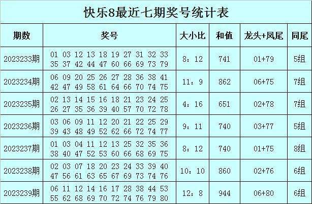 福彩快乐8第2023239期开奖回顾:06 11 12 14 16 17 28 38 44 53 55 62 68 69 70 72 74 76 79 80,其中奖号大小比开出12:8,和值为944,跨度为74,包含6组同尾号:70 80、12 62 72、14 44 74、06 16 76、28 38 68、69 79。