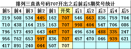 四、排列三直选号码707历史上开出5次,其前后五期奖号分别为: