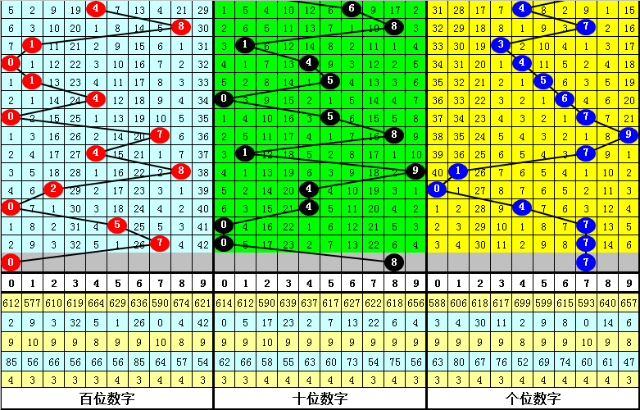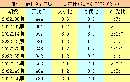 三、体彩排列三前9周星期三奖号分别开出:444-064-997-621-843-048-563-464-789,其中号码012路比为11:11:5,奇偶比为9:18,大小比为13:14;