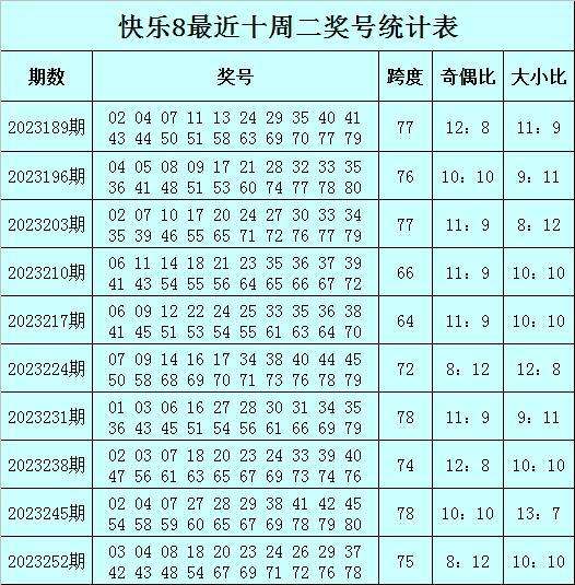 福彩快乐8第2023252期开奖回顾:03 04 08 18 20 23 24 26 29 37 42 43 48 54 67 69 71 72 76 78,其中奖号奇偶比为8:12,大小比为10:10,012路比为9:5:6,首尾间距为75。