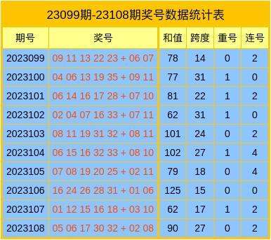 上期开奖:大乐透第23108期奖号开出:05、06、17、30、32 + 02、08。前区号码和值开出90,跨度开出27,未开出重号。后区为“2路、2路”号码。