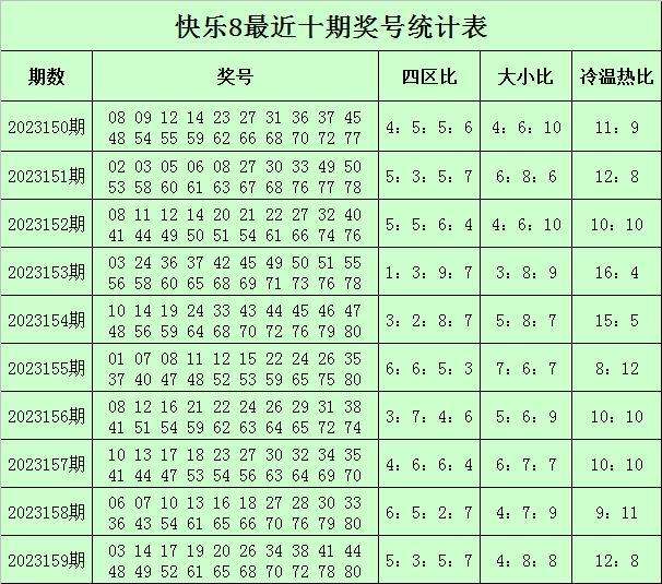 福彩快乐8第2023159期开奖回顾:03 14 17 19 20 26 34 38 41 44 48 49 52 61 65 68 70 72 78 80,其中奖号四区比为5:3:5:7,冷温热码比为4:8:8,大小比为12:8,和值为899,同尾号码为20 70 80、41 61、52 72、14 34 44、38 48 68 78、19 49。