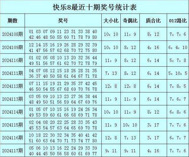 福彩快乐8第2024117期开奖回顾:05 06 10 13 16 22 24 29 33 39 40 44 45 50 56 58 60 61 69 77,其中奖号大小比开出9:11,奇偶比开出9:11,质合比开出4:16,012路比开出7:7:6。