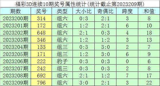 开奖回顾:福彩3D第2023209期奖号为796。奖号形态为组六,大小形态为大大大,奇偶形态为奇奇偶,和值为22,跨度为3。