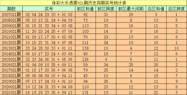 6、在第021期历史同期开奖中,后区奖号跨度分别开出:1-5-5-2-6-1-10-6-1-2-2-7-9-5-3,跨度范围在1-10之间,本期后区跨度参考1。
