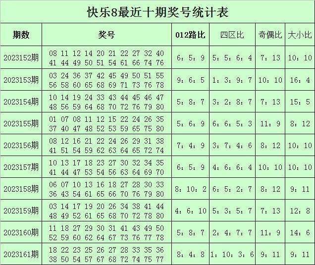 福彩快乐8第2023161期开奖回顾:18 22 23 25 26 27 28 33 35 36 38 50 54 57 67 68 72 74 75 77,其中奖号012路比为8:4:8,四区比为1:10:3:6,奇偶比为9:11,大小比为9:11。