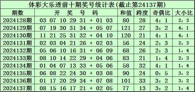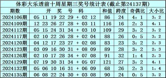 体彩大乐透第24137期奖号为:08 15 16 17 21 + 02 05。前区奖号和值为77,跨度为13,奇偶比为3:2,大小比为1:4。后区奖号和值为7,跨度为3。