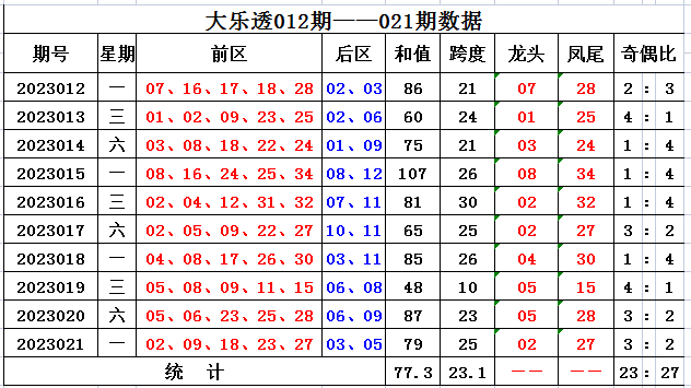 上期回顾,大乐透第2023021开奖,本期奖号:前区02 09 18 23 27;后区03 05,当期前区号码大小比为3:2,三区比2:2:1,奇偶比3:2。前区未开出连号,开出重号23。