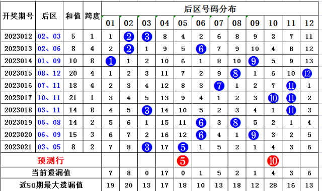 后区冷热分析(最近5期未开出的号码为冷号):上期大乐透后区开出号码03 09,近十期开出冷冷形态2次,冷热形态2次,热冷形态2次,热热形态4次,本期推荐5码:03 05 10 11 12,参考号码05 10。