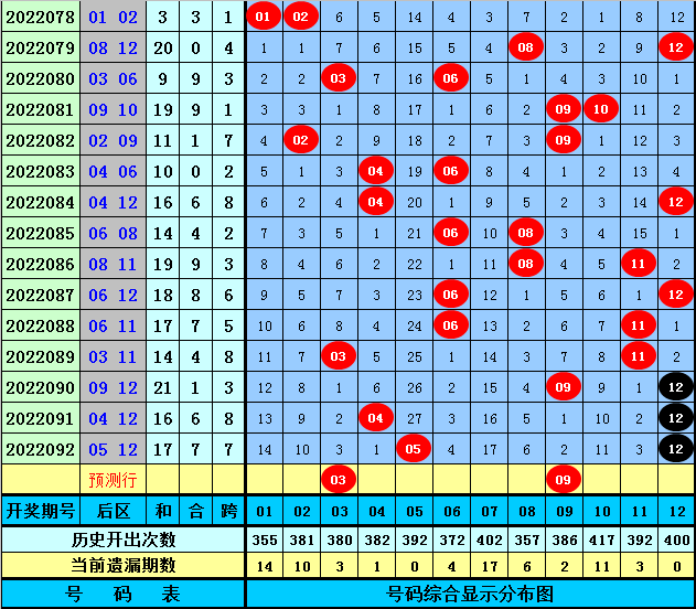 后区分析:上期后区奖号为05+12,遗漏期数为27期+0期。,目前后区热码有6个:03、04、05、09、11、12,后区温码有2个:06、08,后区冷码有4个:01、02、07、10,本期后区看好号码03、04、05、06、09,单挑一注03+09。