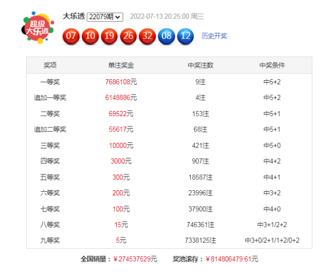 上期开奖:大乐透第2022079期开奖号码:07 10 19 26 32+08 12。其中前区号码012路比为0:3:2,奇偶比为2:3,大小比3:2。后区和值为20,跨度为4。