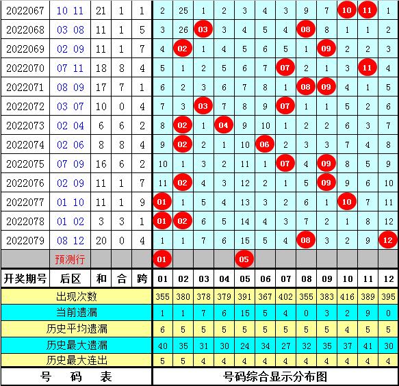 上期后区开出号码:08+12,全偶组合、1路号断档、全大组合。本期后区防0路号断档,两码看好01、05。