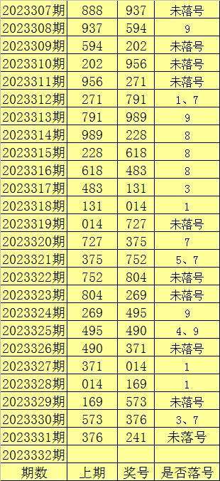 结合其它参数来看,福彩3D第2023332两码关注57、47重点关注57,独胆看好7。