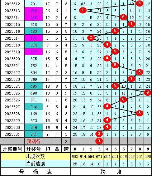 福彩3D第2023331期最大跨度开出3,近期最大跨度波动较大,本期预计最大跨度在1-5区段出现,最大跨度关注12345,重点关注跨度3。
