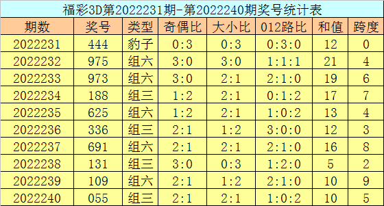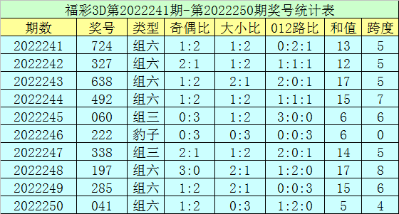 上期回顾:福彩3D第2022250期开奖号码为041,组选类型为组六,奇偶比为1:2,大小比为0:3。