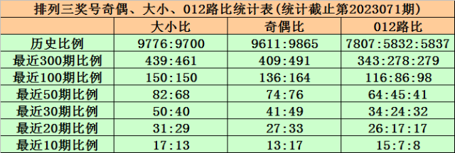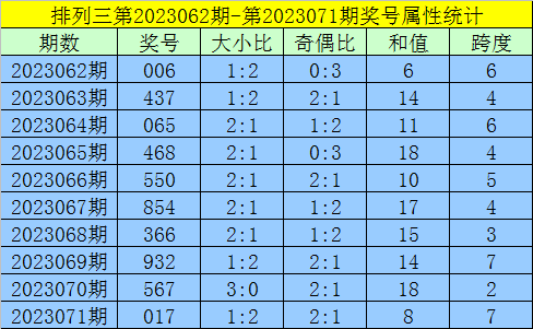 上期回顾:排列三第2023071期出现奖号017。开出组六,奇偶比2:1,012路比1:2:0,大小比1:2,和值8,跨度7。