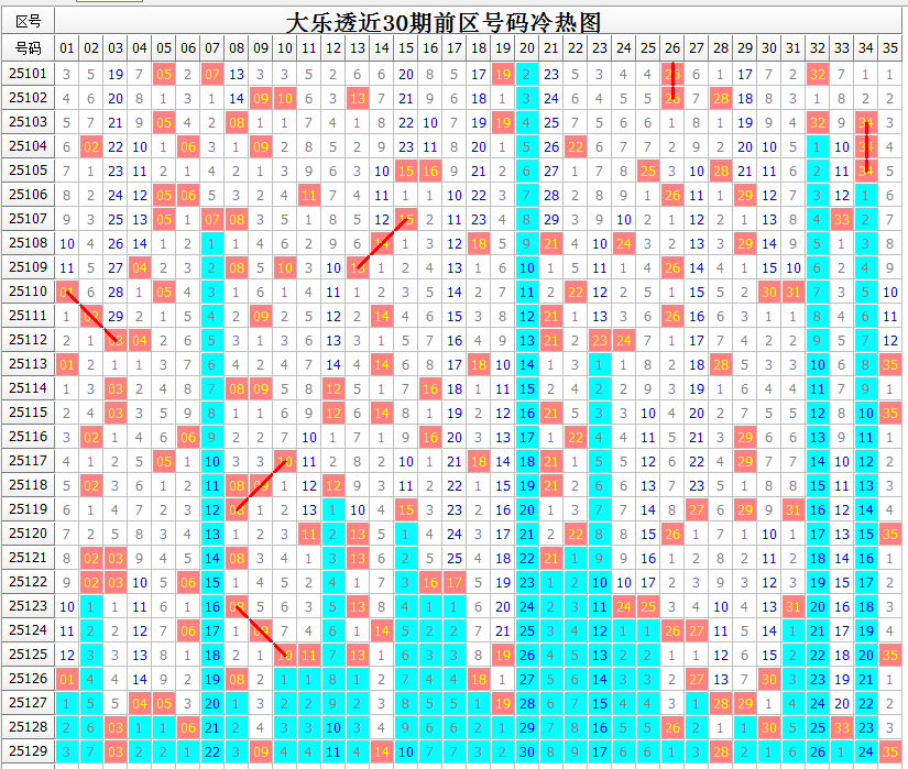大乐透近30期前区号码冷热图(数字为遗漏期数,蓝色标记的为遗漏超过10期的大冷号)