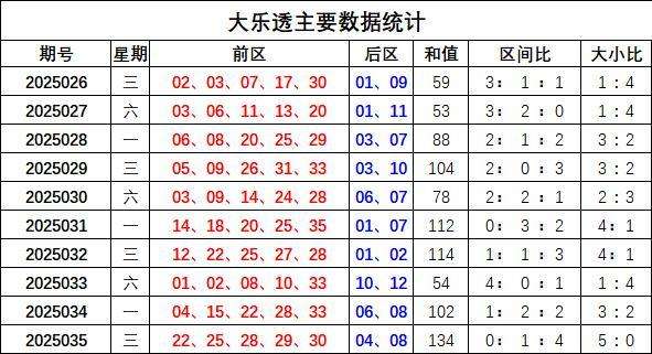 前区大小比分析:上期奖号大小比为5:0,大码球强势开出,近10期大小比为27:23,整体看大码球出现次数较多,本期看好大码球走势较热,推荐大小比为3:2