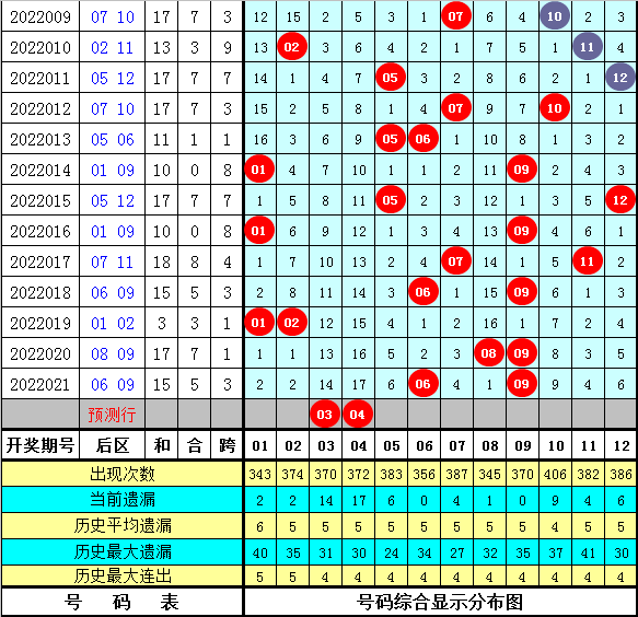 四、后区分析:在022期历史同期开奖中,后区全大组合开出3次,全小组合开出6次,一大一小组合开出6次;后区全奇组合出现1次,全偶组合出现3次,一奇一偶组合出现11次。后区本期防全小组合出现,看好两码03、04。