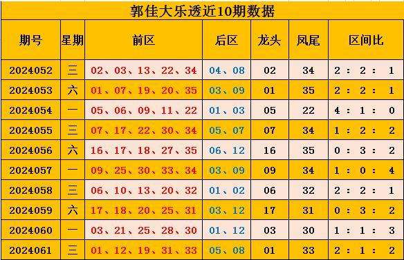 062期郭佳大乐透预测奖号:龙头凤尾区间比分析