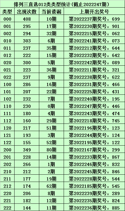 上期回顾:体彩排列三第2022247期开出奖号:446,其012路比为1:2:0,奖号012路类型为:110。