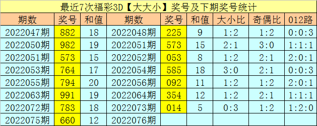 二、最近7次【大大小】奖号之后,其下期分别开出号码:225、573、053、585、092、354、014,其中组三号码出现2次,组六号码出现5次。本期预计开出组六号码。