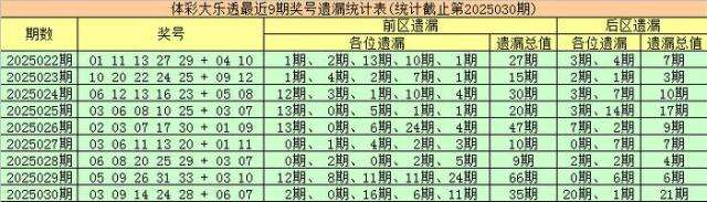 上期回顾:体彩大乐透第2025030期开出奖号为:03 09 14 24 28 + 06 07,其中前区各位奖号分别遗漏:2期、0期、16期、6期和11期,遗漏总值为35期,后区号码分别遗漏20期和1期,遗漏总值为21期。